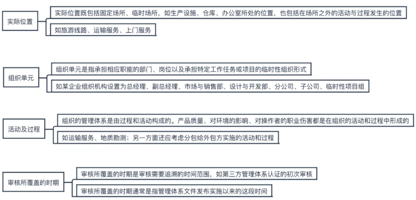 首先,我们了解一下实际位置、组织单元、活动及过程、审核所覆盖的时期这几个名词的定义。